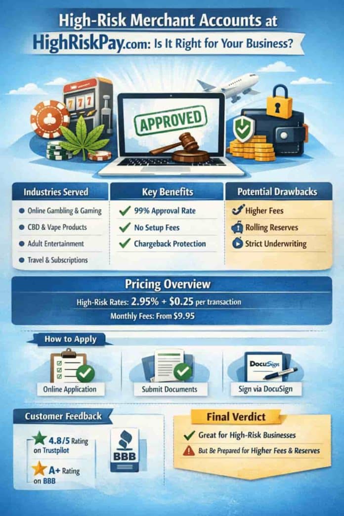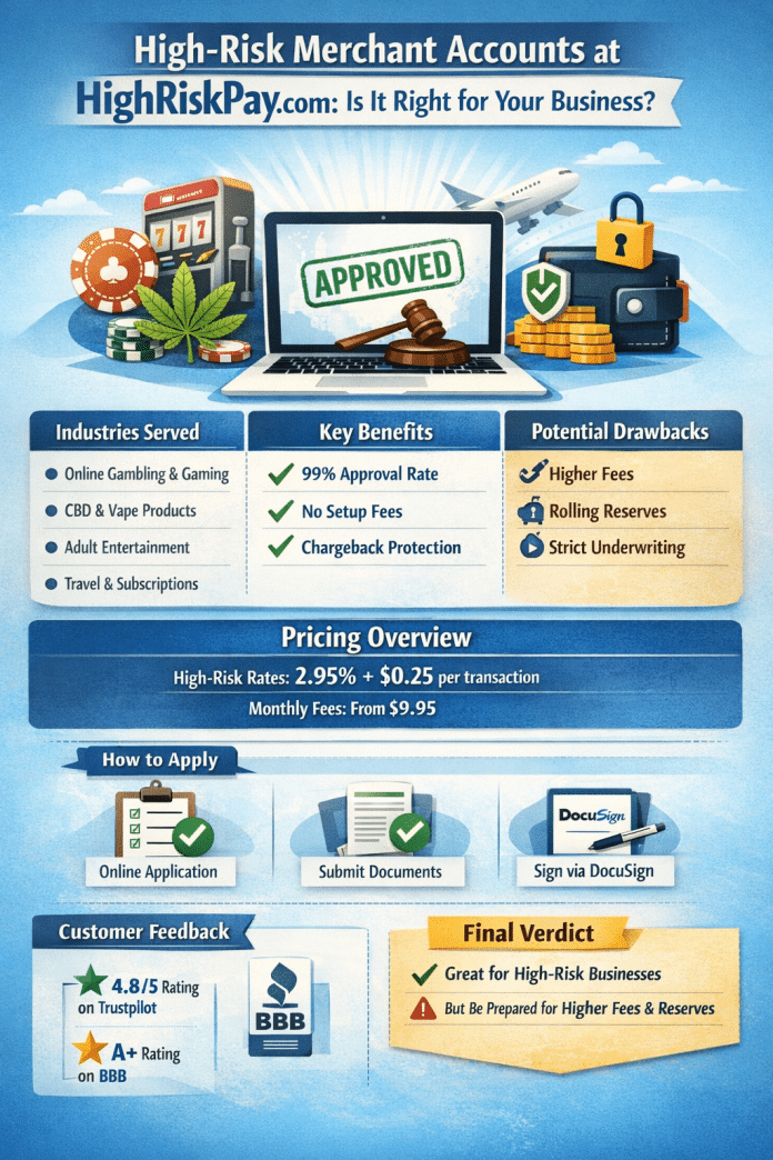 This guide explains what a HighRiskPay.com high-risk merchant account is, which industries it supports, its pricing structure, benefits, drawbacks, and whether it delivers the reliability your business needs.