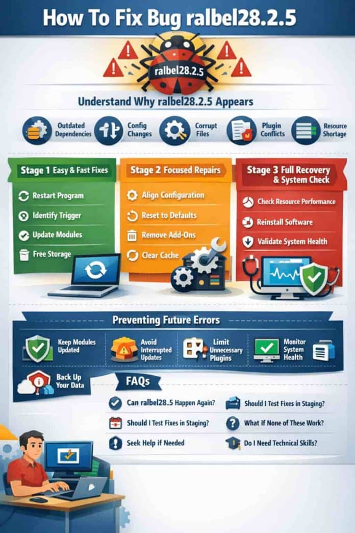 This guide explains how to fix bug ralbel28.2.5 in three progressive stages. Start with the simplest solutions and only move to advanced steps if the problem persists.