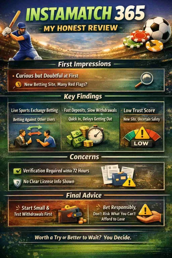However, due to the fact that I had heard people chat about it, I decided to visit it with the proper attitude and get to know what the platform is all about. Having been able to spend some time on the site, to experience everything available, and to test the features, I am prepared to tell you my honest experience, which is easy to understand. There is nothing left out in this article: what Instamatch 365 is, how it works, its betting experience, deposits, withdrawals, why it was or was not safe, customer support, and my last impressions on whether to give it a chance or not.